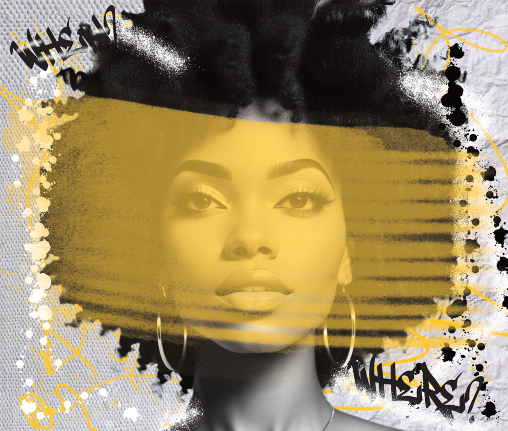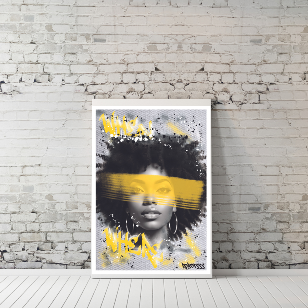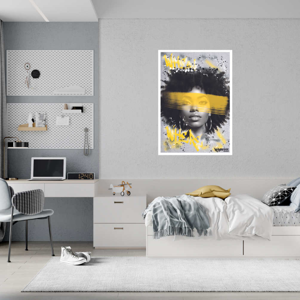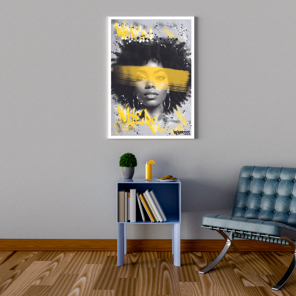 Impresión en lienzo con fondo amarillo y negro de una chica graffiti. ¡Este Graffiti Print es el lindo arte de pared perfecto para tu cocina, sala de estar, estudio, sala de música o donde sea que se necesite una pequeña chispa de color y personalidad!
