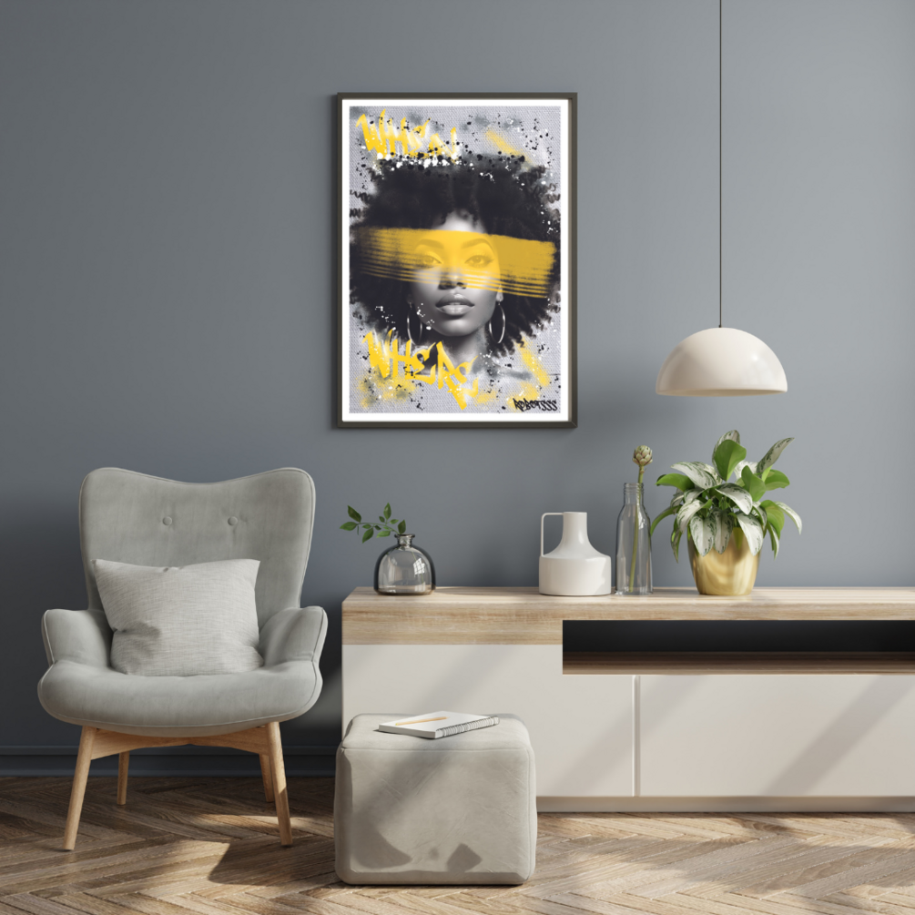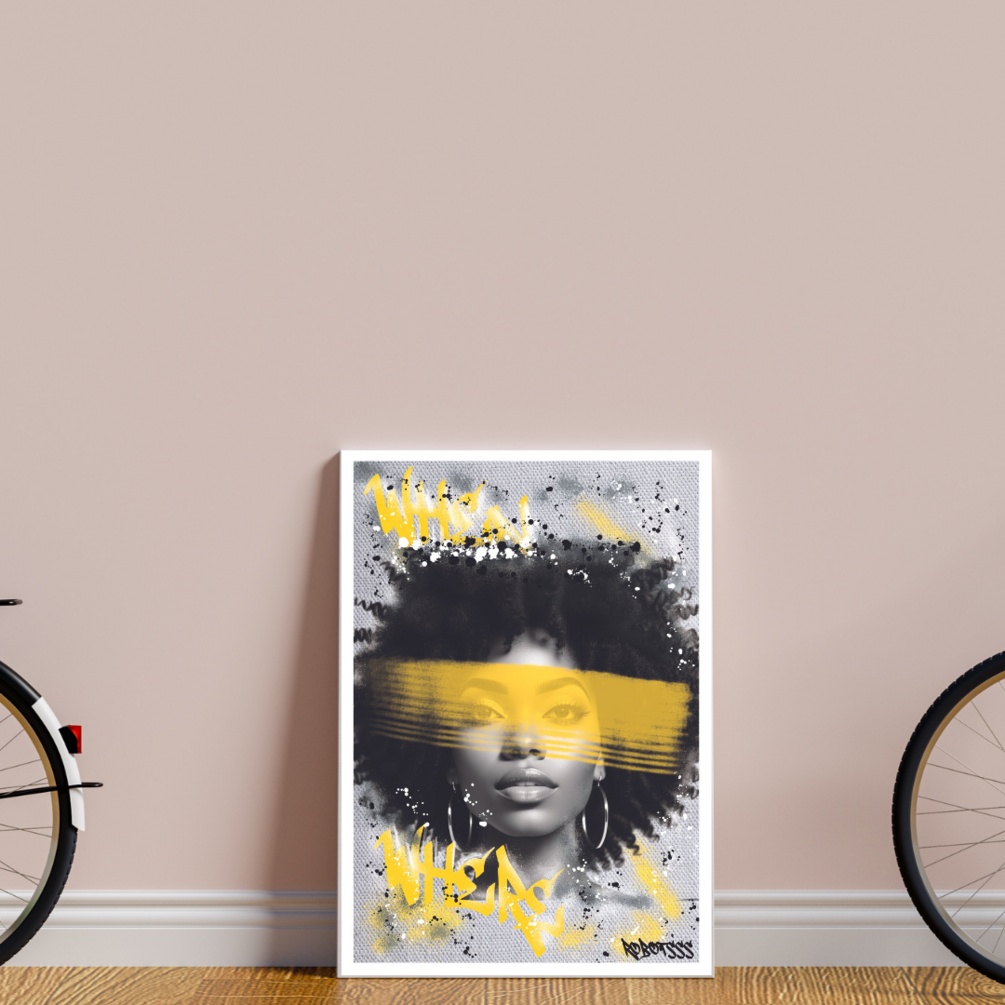 Impresión en lienzo con fondo amarillo y negro de una chica graffiti. ¡Este Graffiti Print es el lindo arte de pared perfecto para tu cocina, sala de estar, estudio, sala de música o donde sea que se necesite una pequeña chispa de color y personalidad!